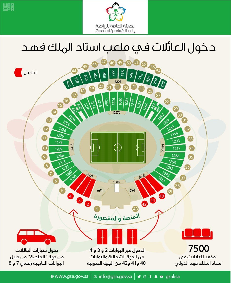 وتم تخصيص مقاعد الدور الخامس بالكامل للعائلات في ملعب الجوهرة، وتخصيص المدرجات الجنوبية الغربية والشرقية في ملعب الأمير محمد بن فهد بالدمام، كما أن المقاعد المخصصة للعائلات في ملعب الملك فهد تتجاوز 7000 مقعد، وتم تخصيص ثلاث بوابات للدخول.