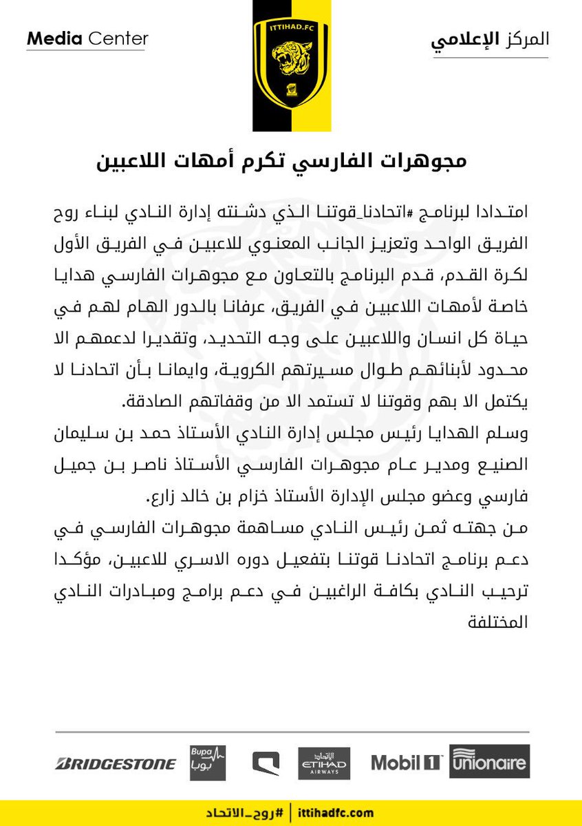 وعلى صعيد آخر تبذل إدارة الاتحاد مساعي كبيرة بشأن التوقيع مع شركة كبيرة لرعاية النادي خلال الفترة المقبلة بدعم من قبل رئيس هيئة الرياضة معالي المستشار تركي آل الشيخ، وذلك خلال الفترة القليلة المقبلة، وكانت إدارة الاتحاد قد وقعت أمس رعاية مع شركة مياه وستكون هذه الرعاية على اللوحات الإعلانية للمباريات التي يلعب بها الفريق في ملعب الجوهرة ولن تكون على قمصان اللاعبين.