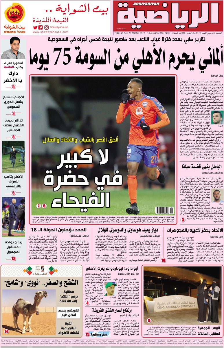 وعلى الصعيد الفني، يغادر فريق الاتحاد إلى الرياض اليوم؛ استعدادا لكلاسيكو الهلال يوم غد السبت، ضمن الجولة السابعة عشرة من دوري المحترفين.