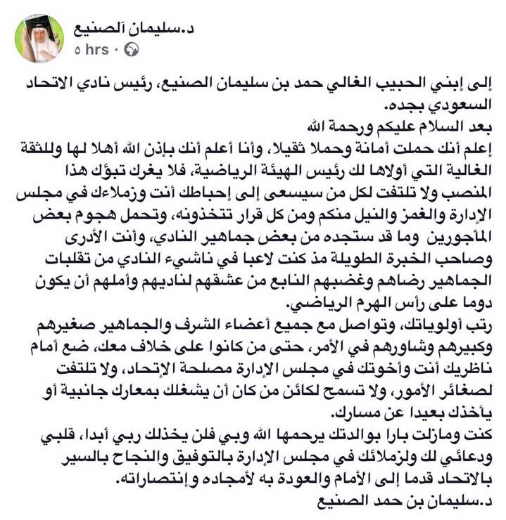 وكانت الهيئة العامة للرياضة، قد أنهت تكليف إدارة نادي الاتحاد برئاسة الحائلي، وكلفت حمد الصنيع، بمنصب رئيس النادي.