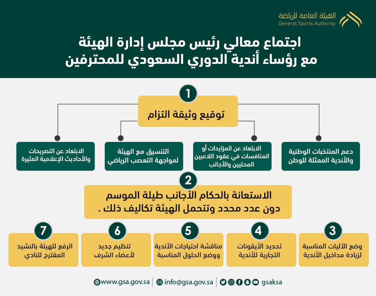 جاء ذلك في الاجتماع الذي عقده رئيس مجلس إدارة الهيئة العامة للرياضة مع رؤساء أندية الدوري السعودي للمحترفين ظهر أمس (الاثنين).