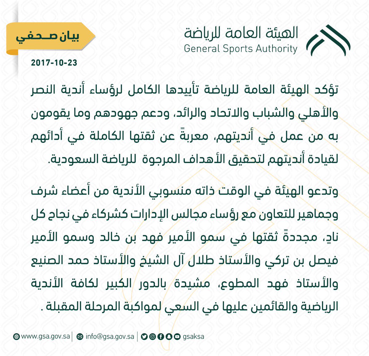 وفي بيان ثاني للهيئة العامة للرياضة، أكدت فيه تأييدها الكامل لرؤساء أندية النصر، الأهلي، الشباب، الاتحاد، والرائد، جاء فيه "تؤكد الهيئة العمة للرياضة تأييدها الكامل لرؤساء أندية النصر، والأهلي، والشباب، والاتحاد، والرائد، ودعم جهودهم وما يقومون به من عمل في أنديتهم، معربة عن ثقتها الكاملة بأدائهم لقيادة أنديتهم لتحقيق الأهداف المرجوة للرياضة السعودية".