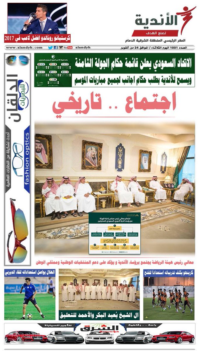 وجاء في بيان الهيئة العامة للرياضة "تمت مناقشة اختيار الأيقونات التجارية لكل نادٍ وما سيتم من إجراءات حيالها لضمان حصول مزيد من الفرص الاستثمارية والتسويقية لدعم خزائن الأندية ورفع مداخيلها، كما تم التوقيع على وثيقة التزام بين رؤساء الأندية تتضمن الابتعاد عن أي مزايدات أو منافسات في عقود اللاعبين المحليين أو الأجانب إضافة إلى دعم المنتخبات السعودية في مشاركاتها القارية والدولية وعلى رأسها المنتخب السعودي الأول خلال تحضيراته للمشاركة في مونديال 2018م".