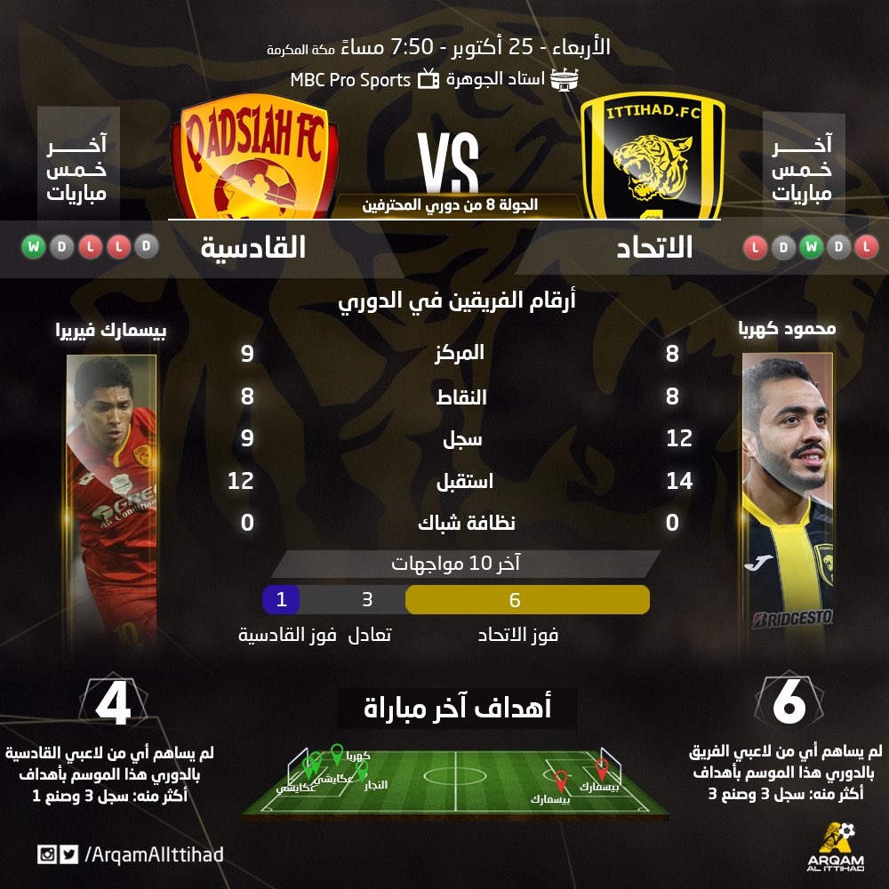 على ملعب الجوهرة. يستضيف الاتحاد الجريح فريق القادسية، في محاولة للتعافي بعد بداية متواضعة للموسم، الاتحاد يعاني من اهتزاز نفسي رهيب؛ بسبب الخسارة الكبيرة من الأهلي بثلاثية. الاتحاد برصيد ثماني نقاط، مازال يبحث عن نفسه بين أندية الدوري، فالفريق في سبعة لقاءات تلقى 3 هزائم مؤلمة من الباطن والفيصلي والأهلي، فيما تعادل مع أحد، والهلال وفاز على الفيحاء، والتعاون. جماهير النادي أعلنت مقاطعتها للمباراة؛ بسبب سوء الأداء.